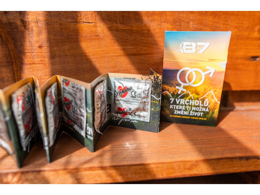 7+1 ks kondomů značky Pepino ve stylové krabičce s motivem Beskydské sedmičky.